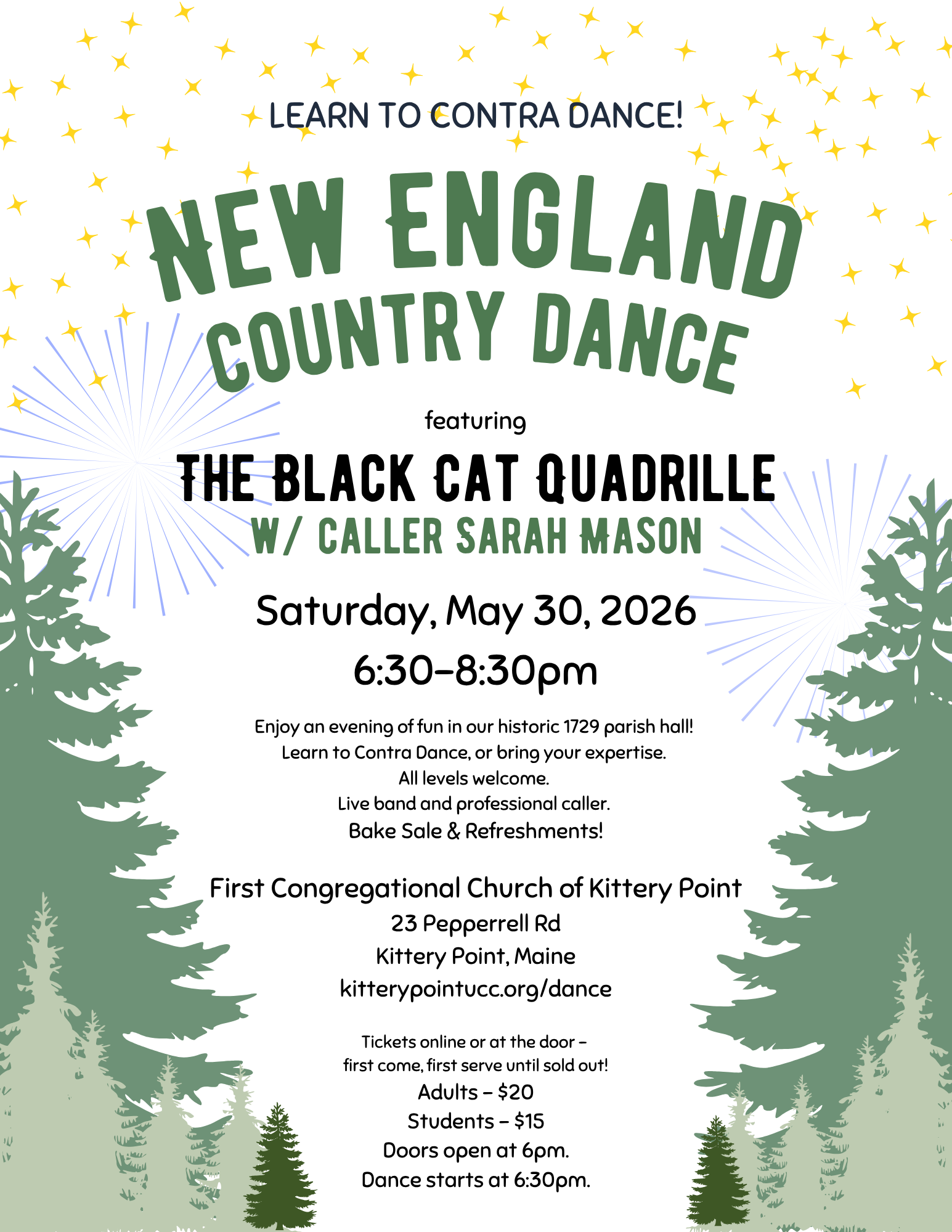 Enjoy an evening of fun in our historic 1729 parish hall! Learn to Contra/Country Dance, or bring your expertise. All levels welcome. Live band and professional caller. Bake Sale & Refreshments.